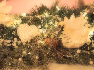 If you peek under the tree you will find Sevres porcelain objects, a fan with her monogram on it, a nosegay from a grand ball, and a pinkish clock for her mantel.